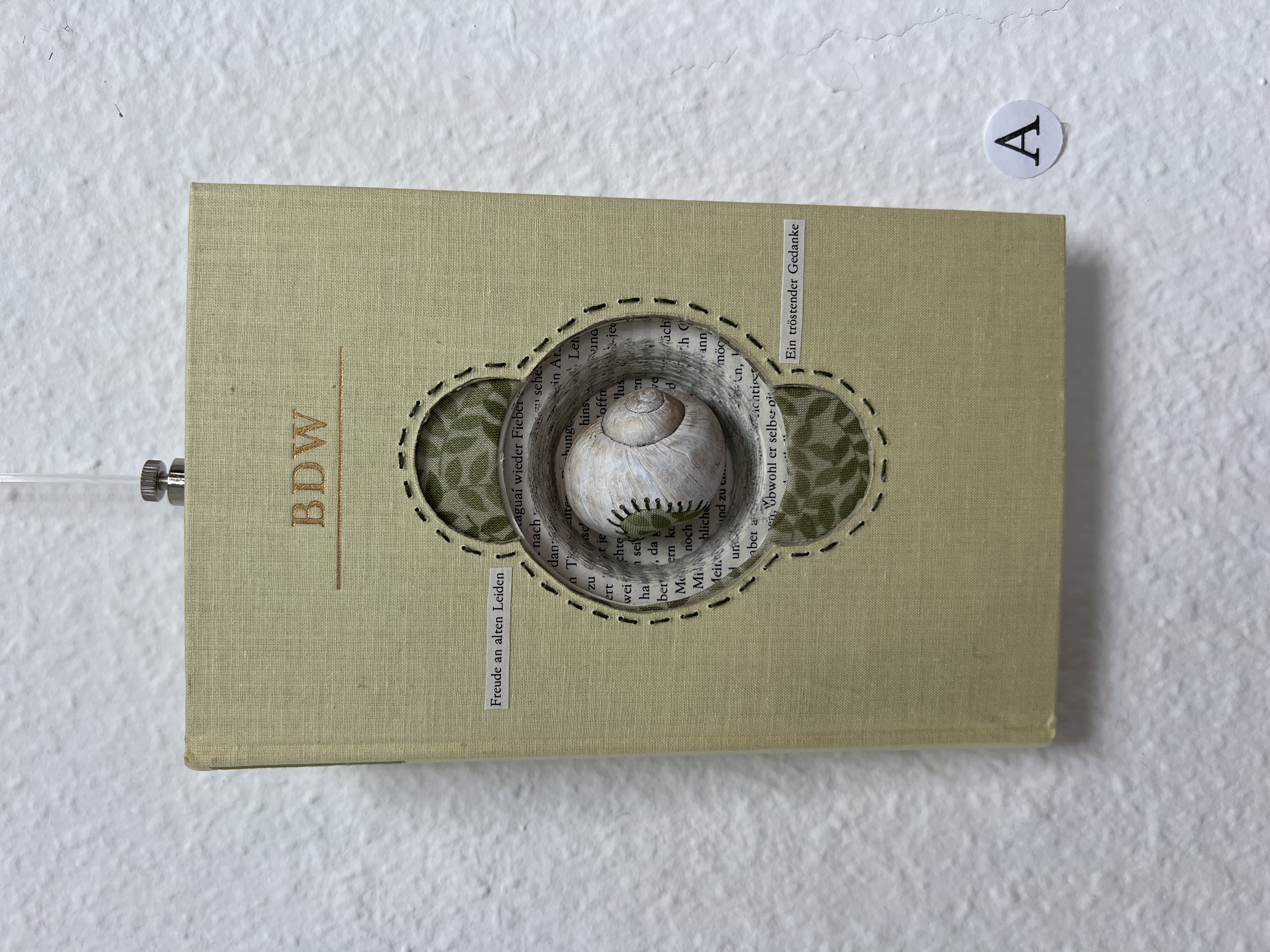 In diesem Werk verbinde ich die Natur mit der Literatur auf eine subtile, aber tiefgehende Weise. Im Zentrum des Buches habe ich eine Schnecke eingefasst, deren Form und Struktur für mich das Thema des Rückzugs und der Langsamkeit symbolisiert. Die feinen Stichlinien um die Schnecke herum greifen die organische Form auf und leiten den Blick behutsam in die Tiefe des Buches.